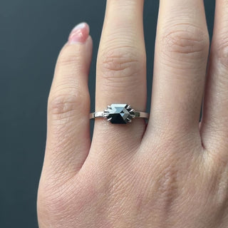 The ring features a beautiful 1.41 carat black hexagon rose cut diamond. The diamond is a top quality all-natural diamond; it is opaque with unique facets that catch the light. The diamond has been set east to west in a low-profile backplate, double prong setting - allowing the ring to sit directly on the finger. The backplate of the diamond has a window opening that allows light to illuminate through beautifully.