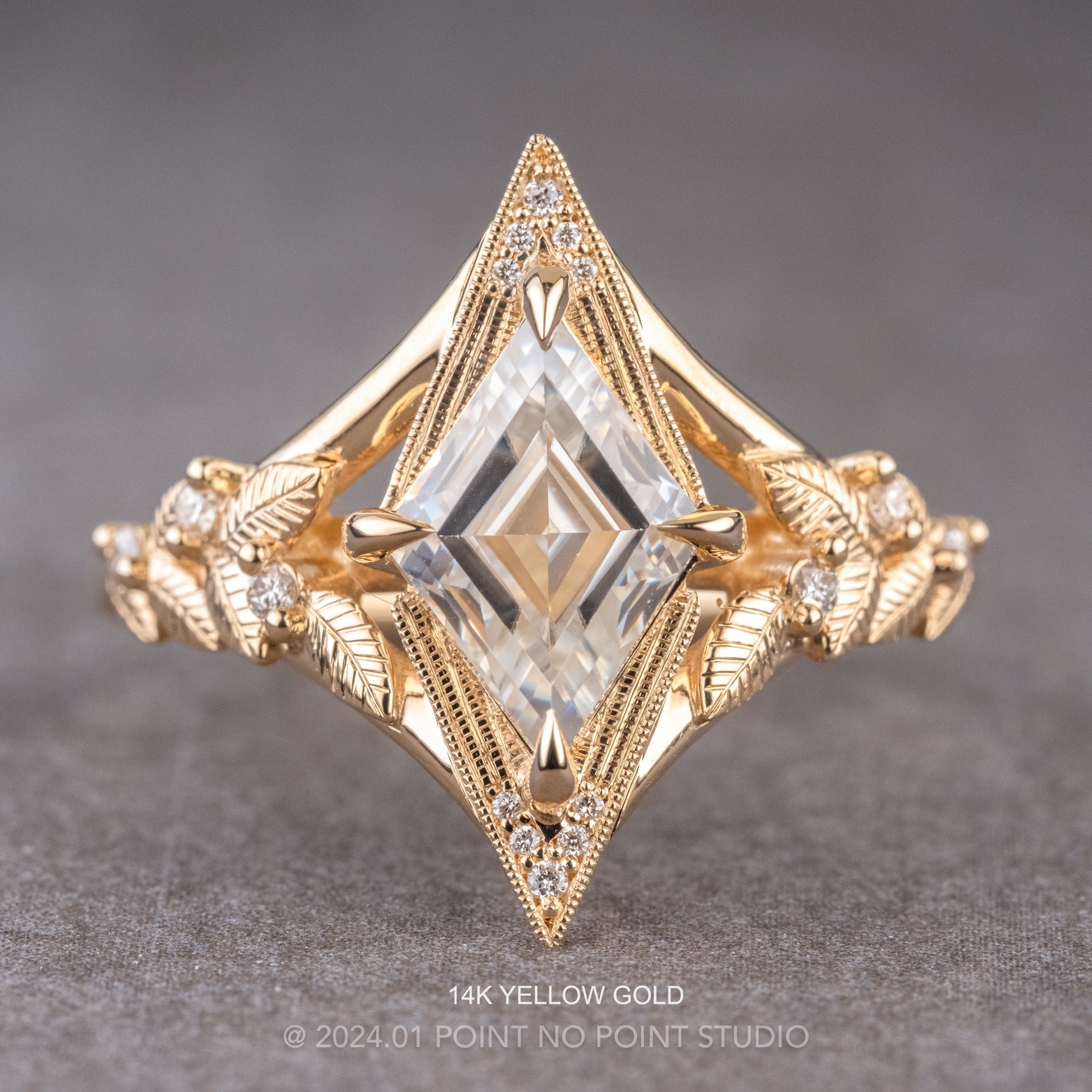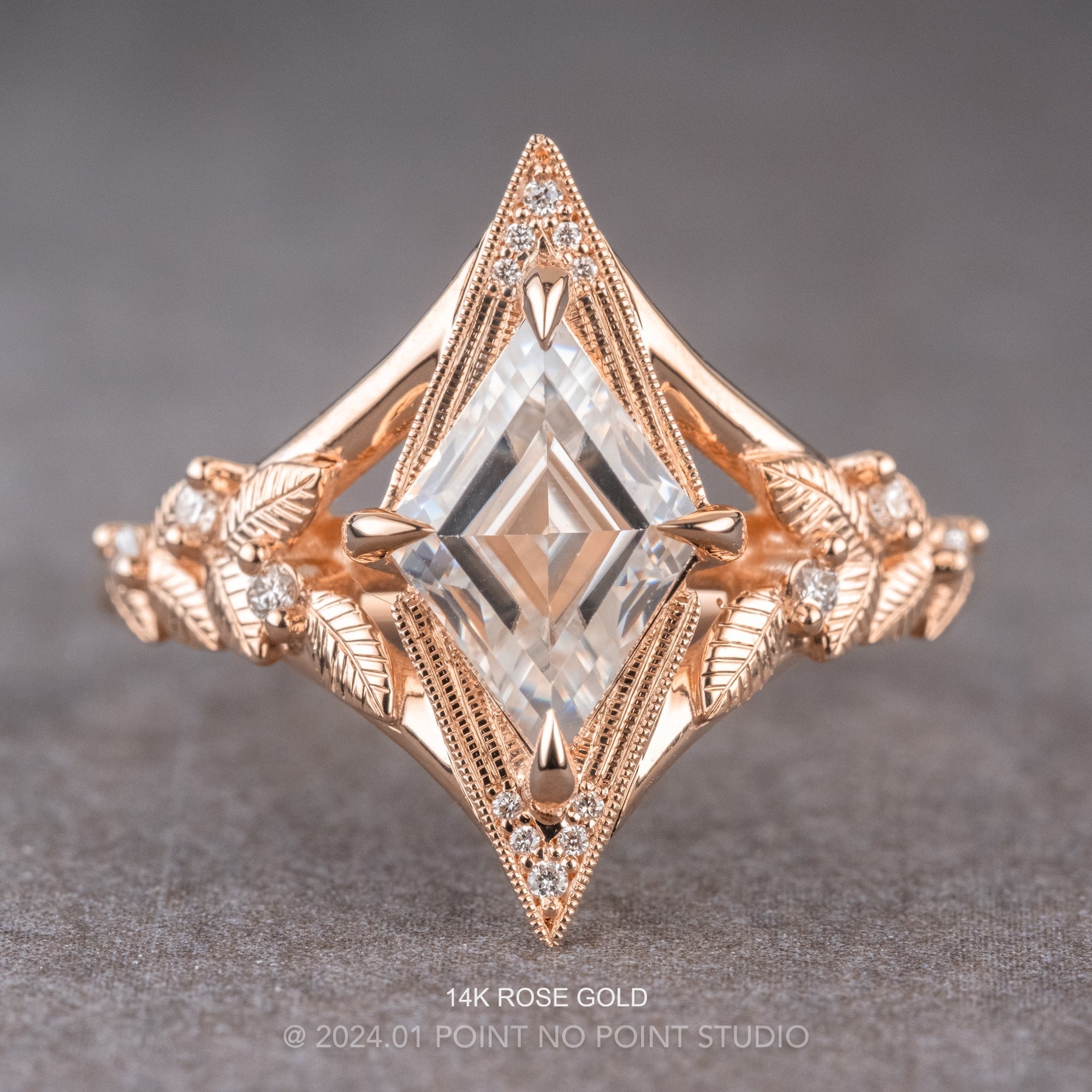 This magical ring features a stunning step cut lozenge shaped moissanite. The moissanite is set into an open back setting to allow the light to shine through. The ring features stunning milgrain around the GHSI white accent diamonds and asymmetrical hand engraved leaf designs - this ring is truly one-of-a-kind!