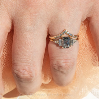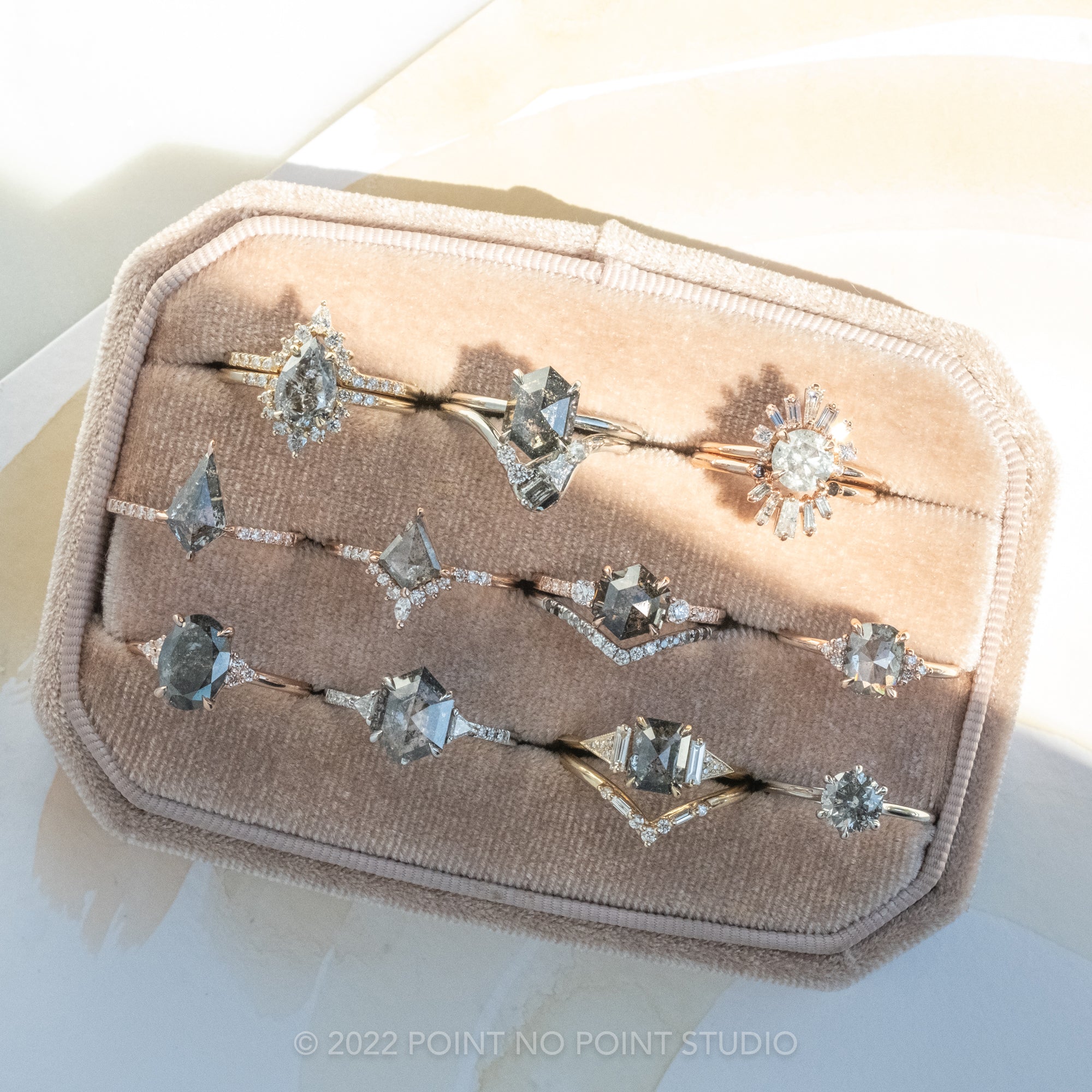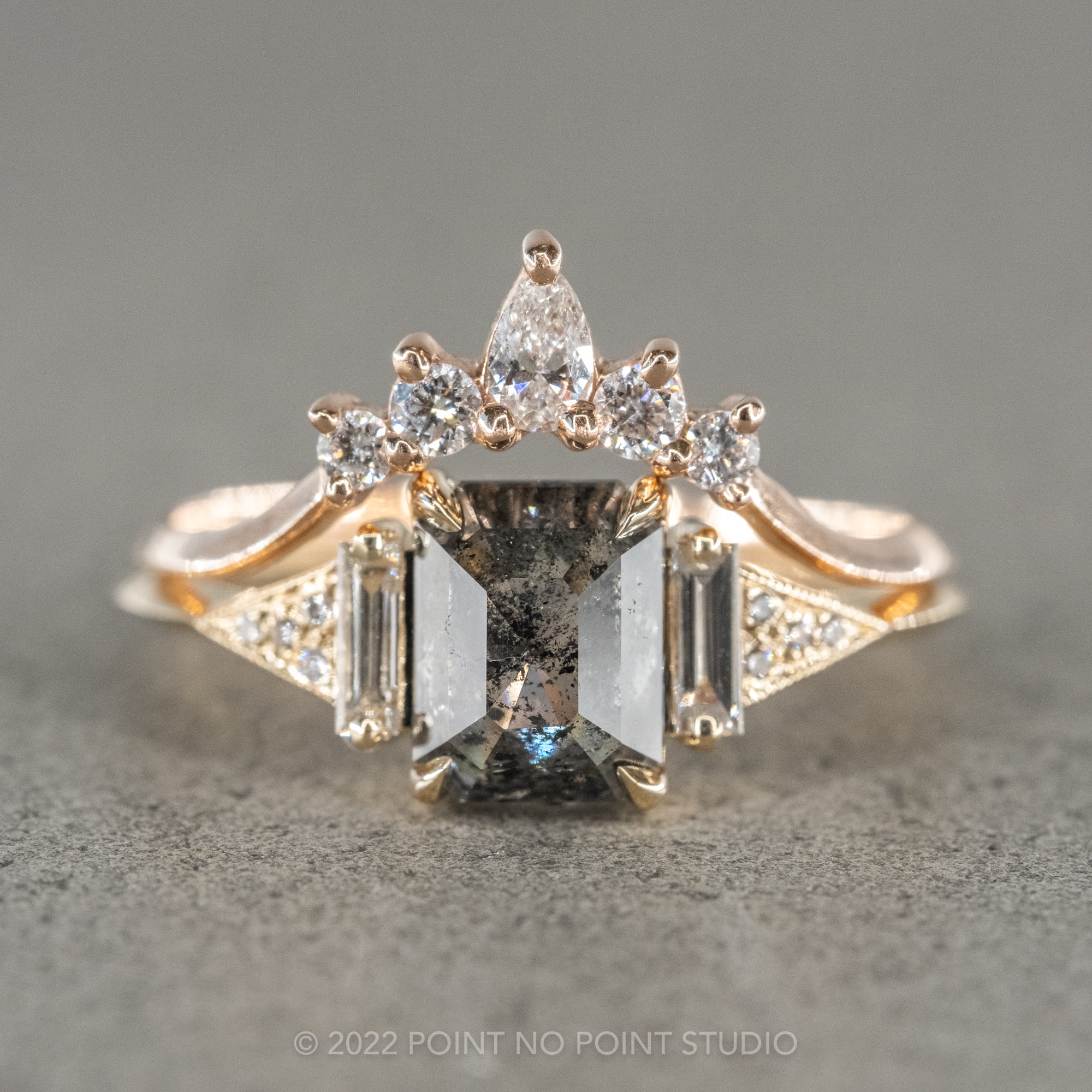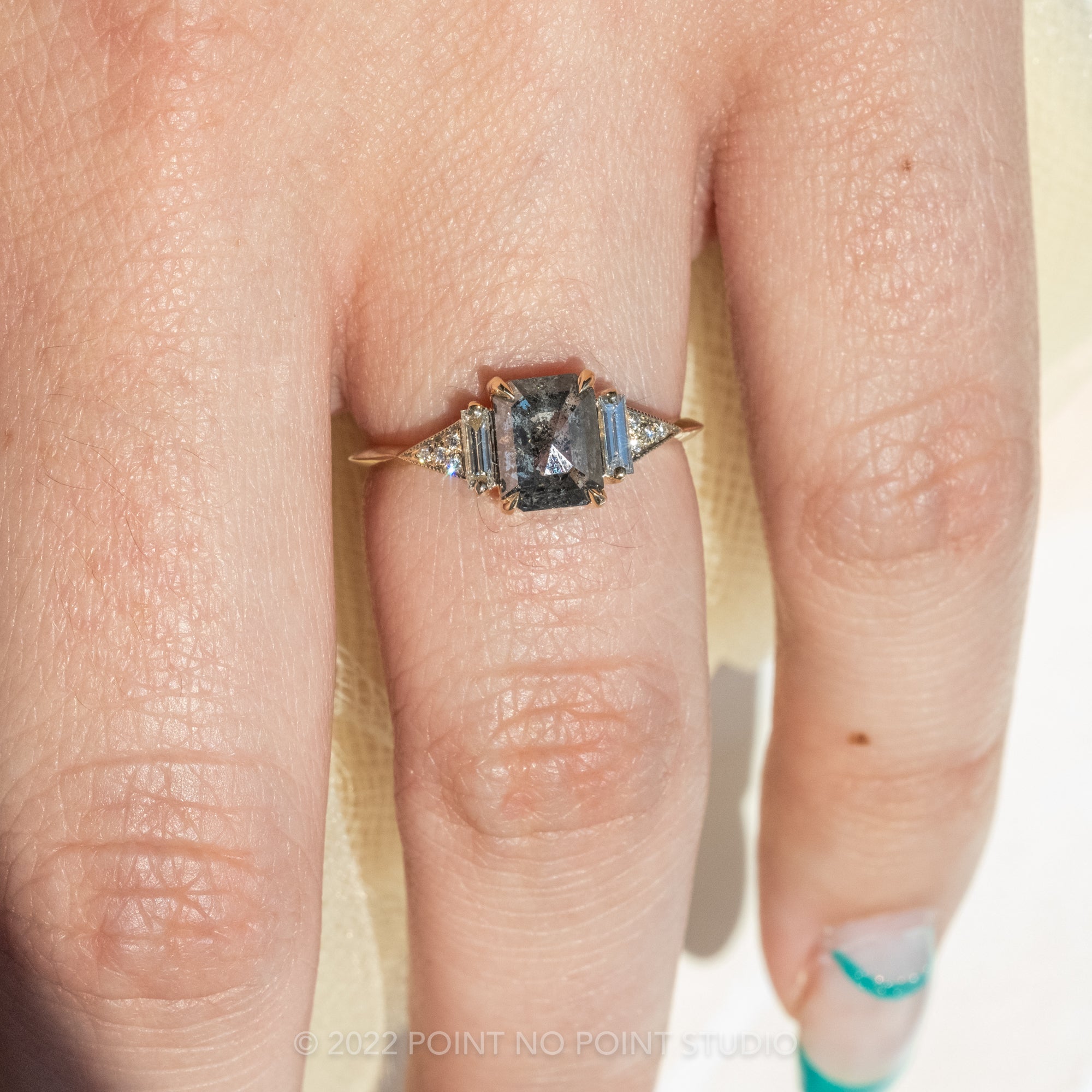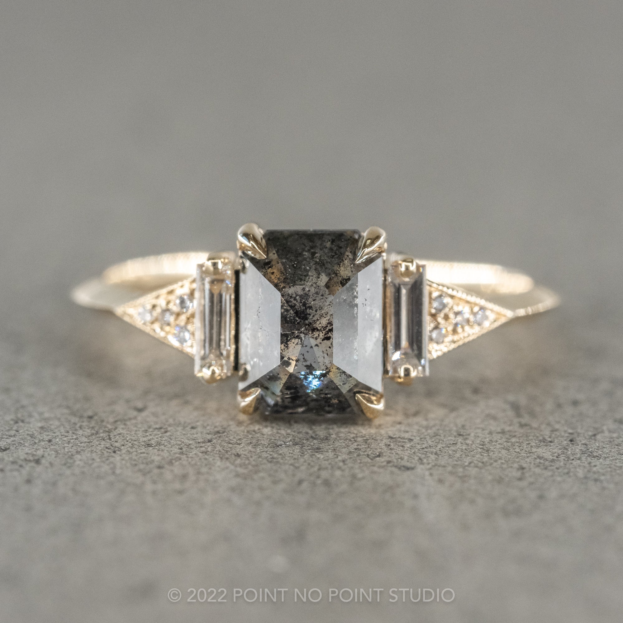 This timeless ring features a stunning 1.19 carat salt and pepper emerald shaped rose cut diamond. The emerald diamond is an all-natural, semi-translucent diamond with salt and pepper inclusions.