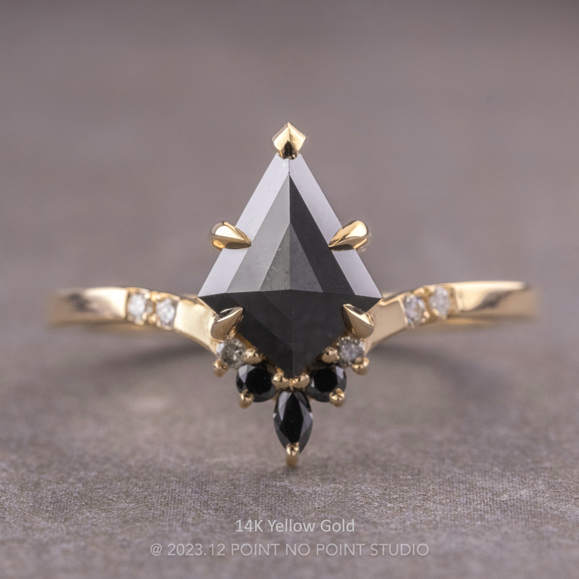 This timeless and unique engagement ring features a striking 1.76 carat black rose cut kite diamond. The diamond is a top quality un-enhanced diamond with unique tones and facets that catch the light. The band gently slopes to the contour of the kite diamond with a gradient of black, grey and white diamonds.