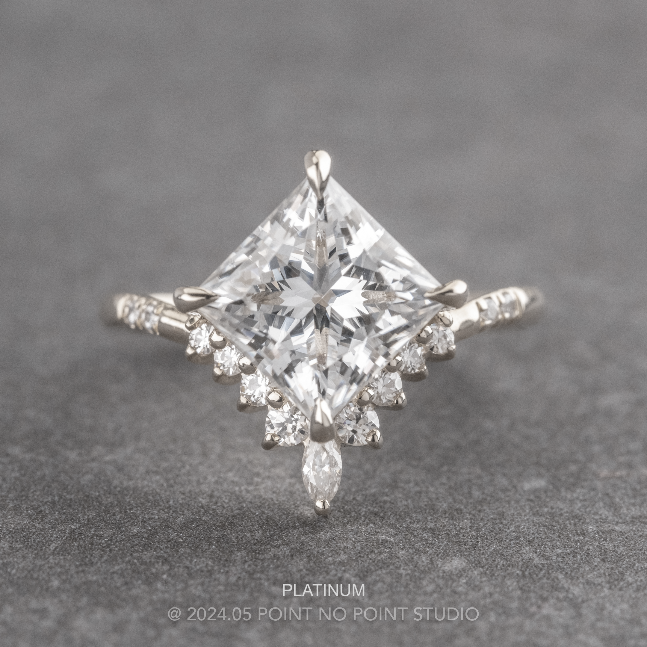 1.91 Carat Princess Cut Moissanite and Diamond Engagement Ring, Flora Setting