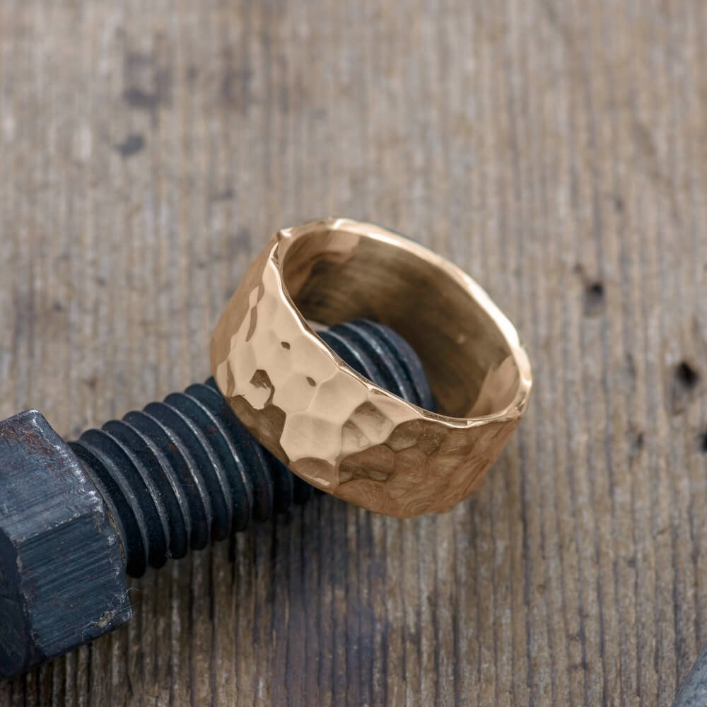 10mm 14k Peach Gold Mens Wedding Band, Hammered Polished