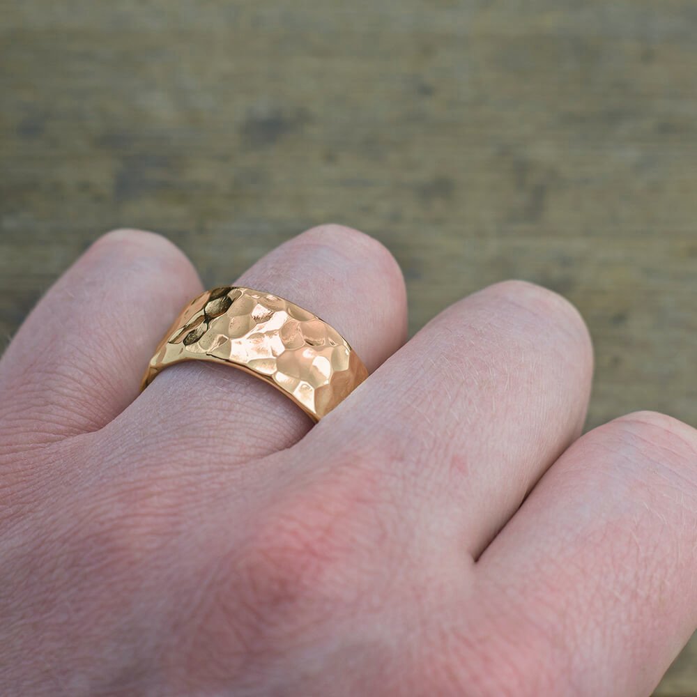 This ring is made of solid recycled 14k Peach Gold which is hammered by hand to give it a uniquely textured finish and rugged character. The outside of the ring has also been given a high polished finish. The entirety of the ring band is smooth and polished for beauty and comfort.