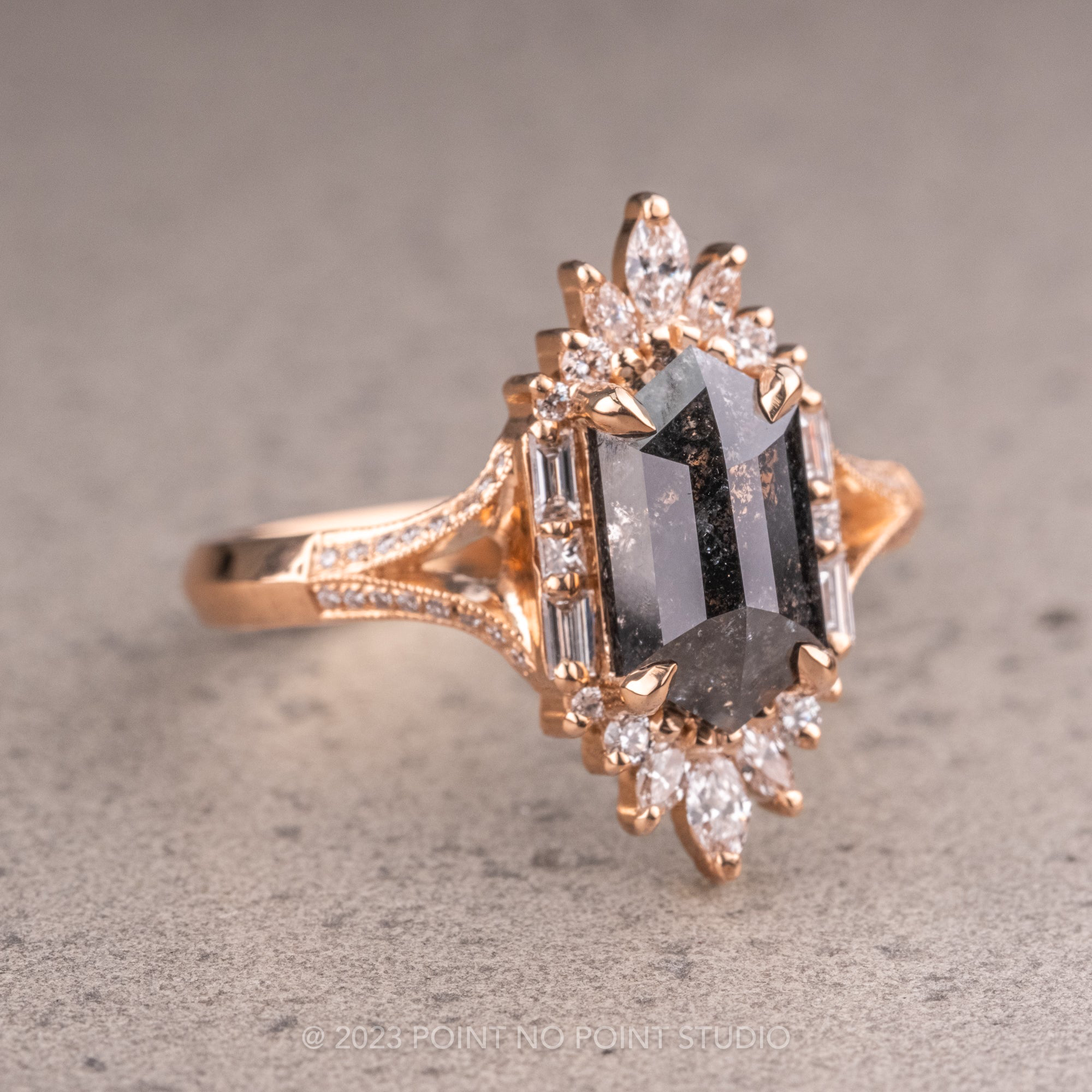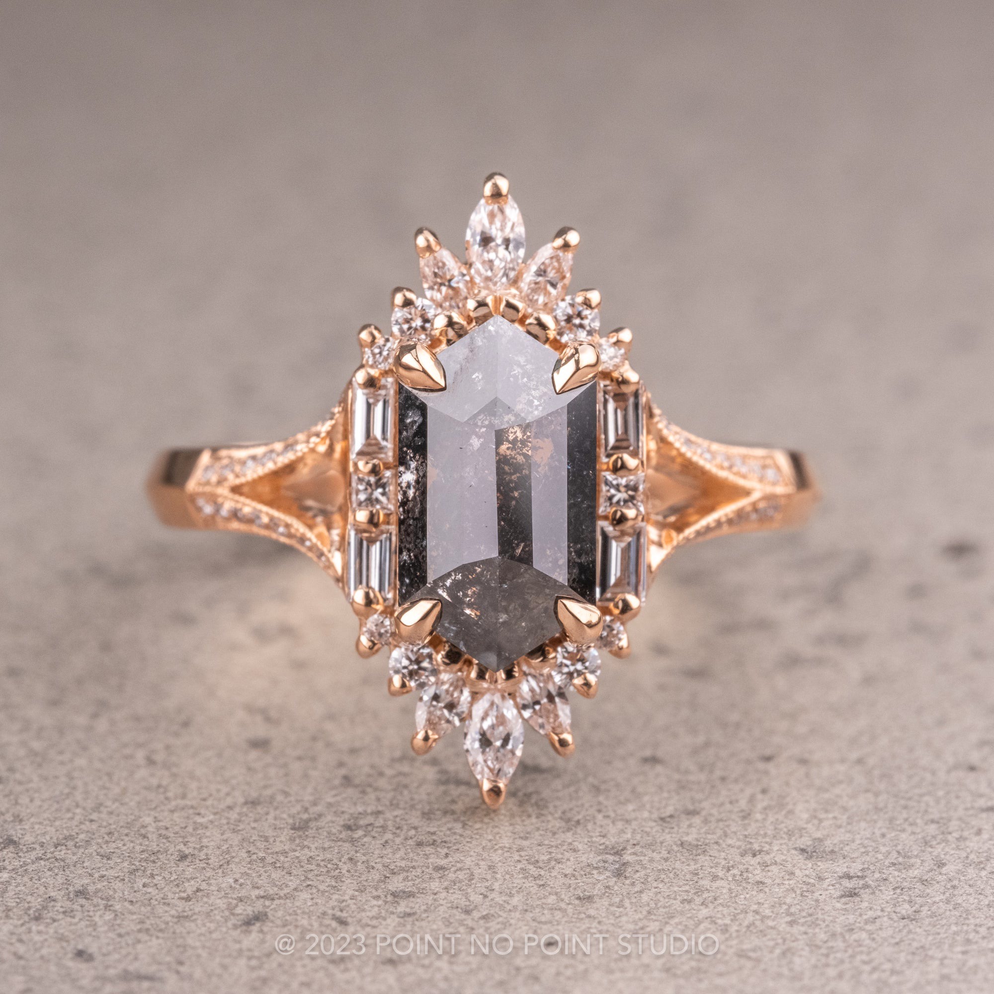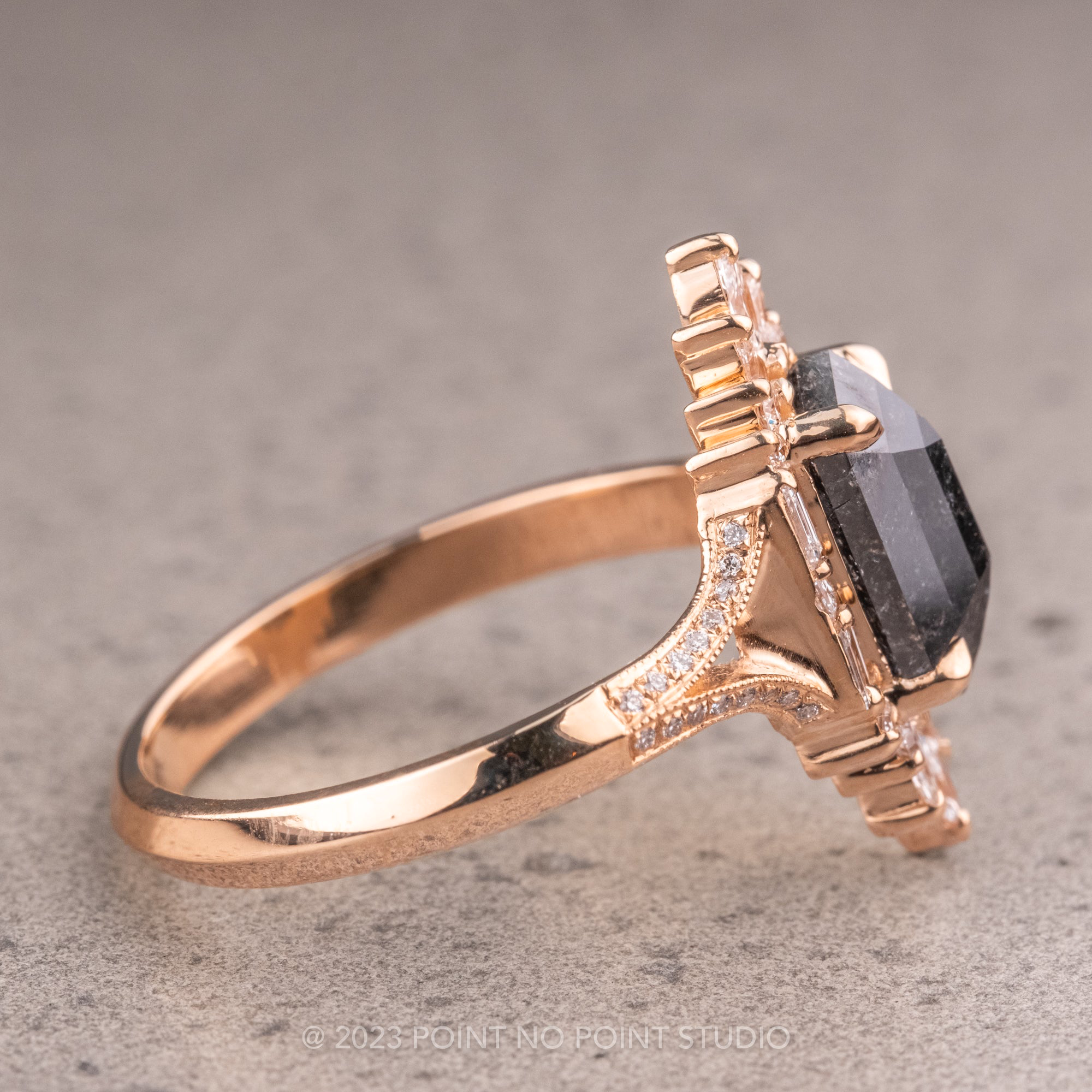 2.18 Carat Black Hexagon Diamond Engagement Ring, Amelia Setting, 14K Peach Gold