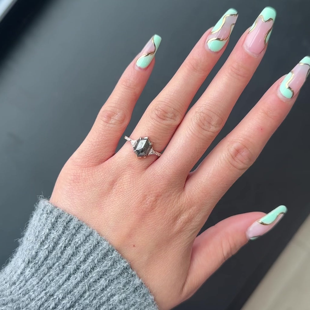 2.59 Carat Black Speckled Hexagon Diamond Engagement Ring, Eliza Setting, 14K Rose Gold