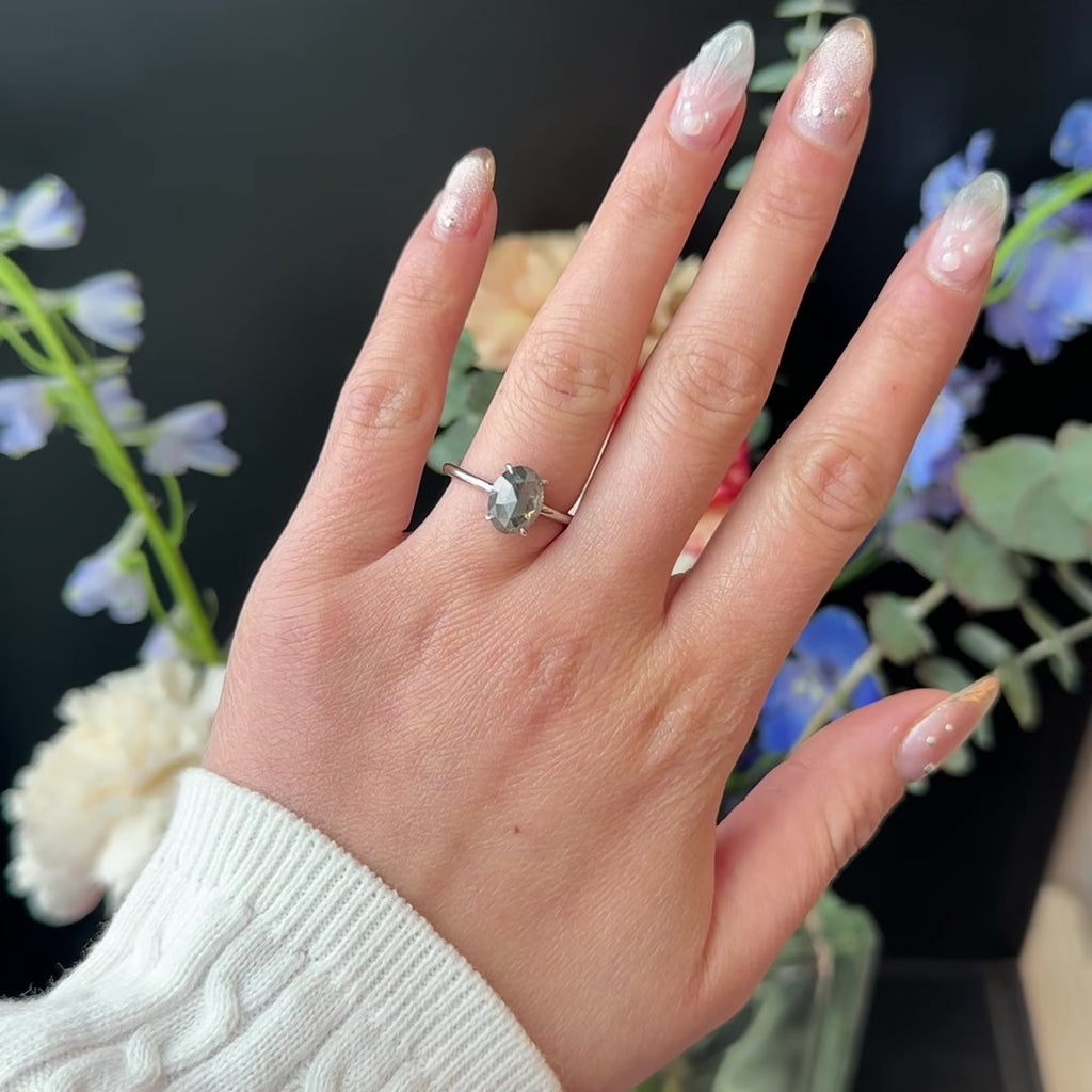 The ring features a beautiful black 2.64 carat salt and pepper rose cut oval diamond. The diamond is a top quality, all-natural diamond. The faceting on the oval diamond really allows this ring to sparkle, like a dark disco ball!