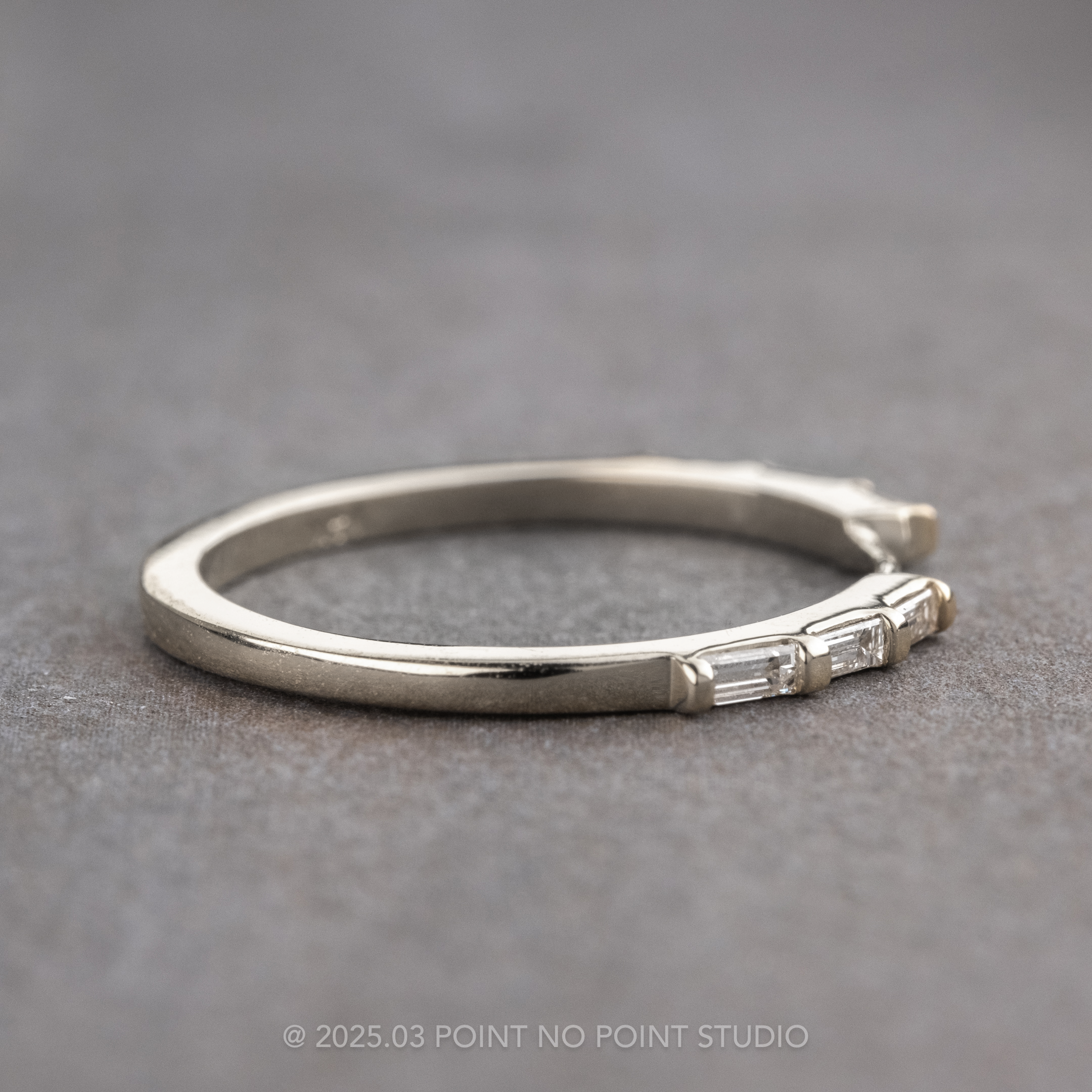 The unique ring features a versatile open cuff design that will complement almost any engagement ring! The cuff design was made with low-profile engagement rings in mind - the cuff satisfies the look of a straight across wedding ring that typically is not able to slide under a low-profile setting. The cuff features three sparkly GHSI baguette diamonds on either side of the opening. The entire ring is made of eco-friendly recycled platinum.