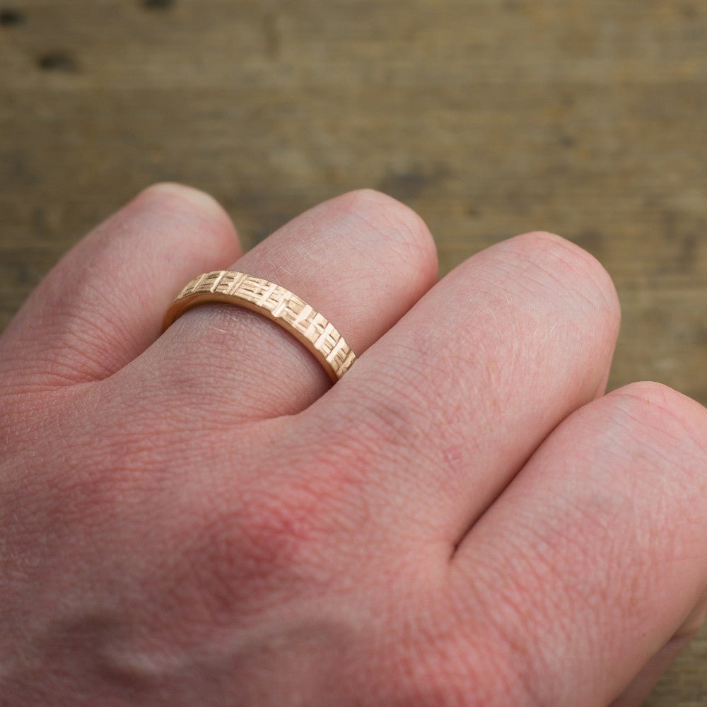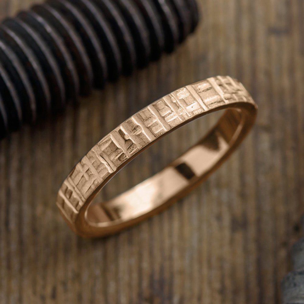 This ring is made of solid recycled 14k Peach Gold which is hammered by hand to give it a textured finish and character. The inside of the ring band is smooth and polished for beauty and comfort.