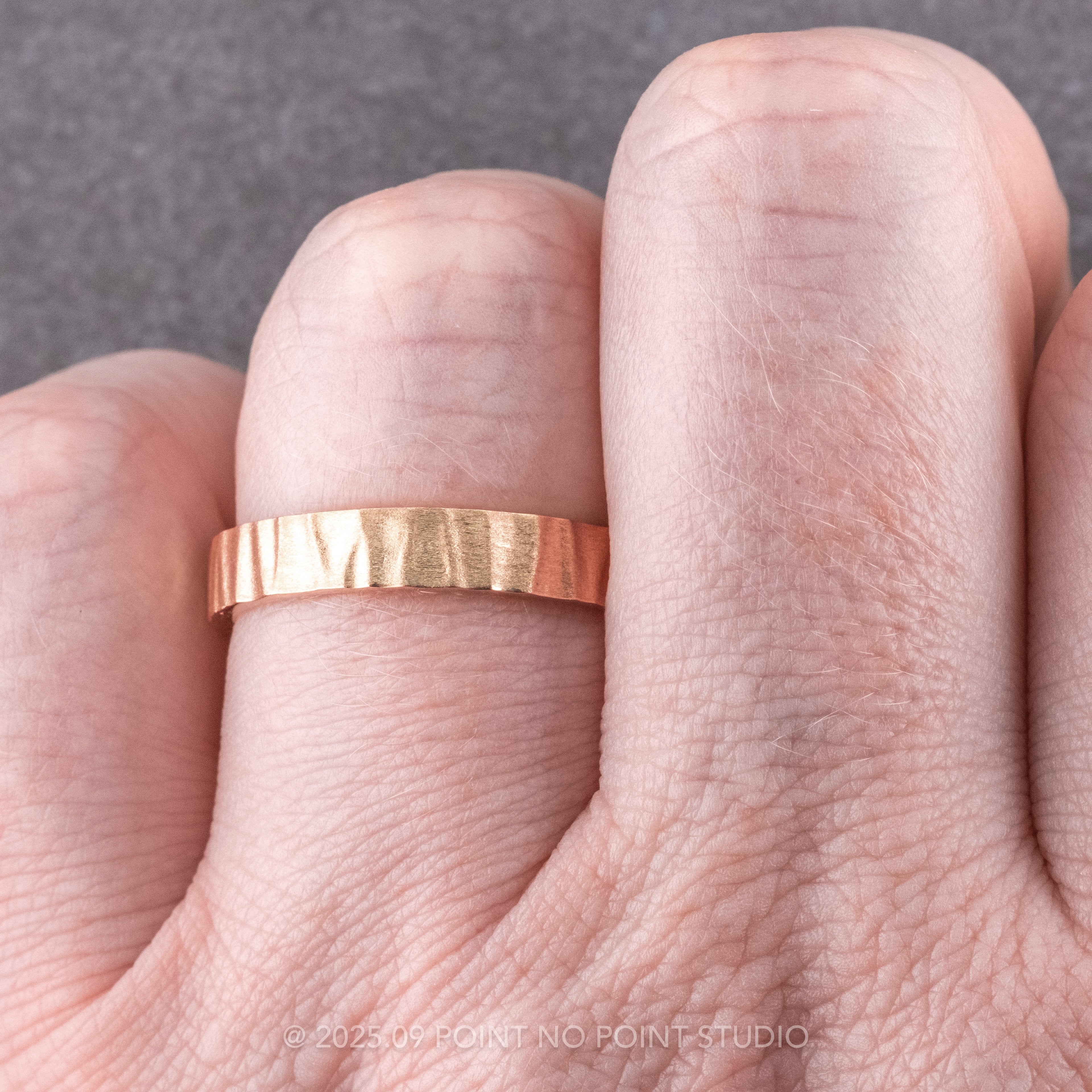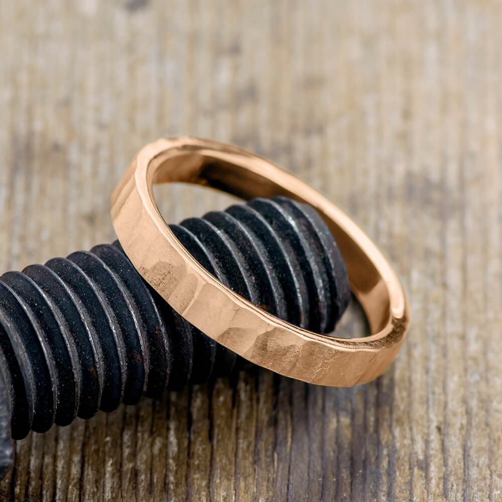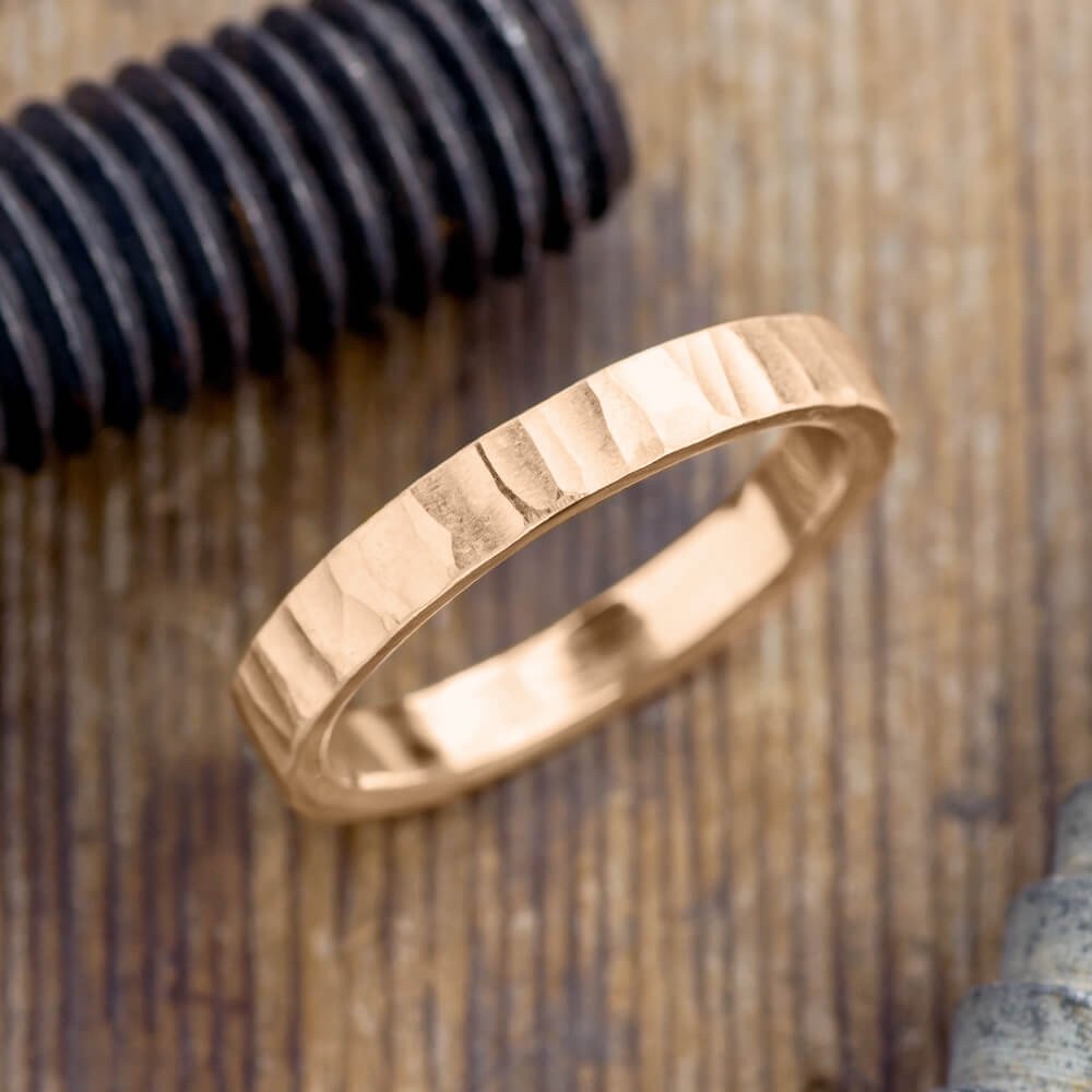 This ring is made of solid recycled 14k Peach Gold; each ring is textured by hand adding a rugged, durable surface that looks like naturally occurring wood grain. The inside of the band is polished smooth, and fits comfortably around your finger.