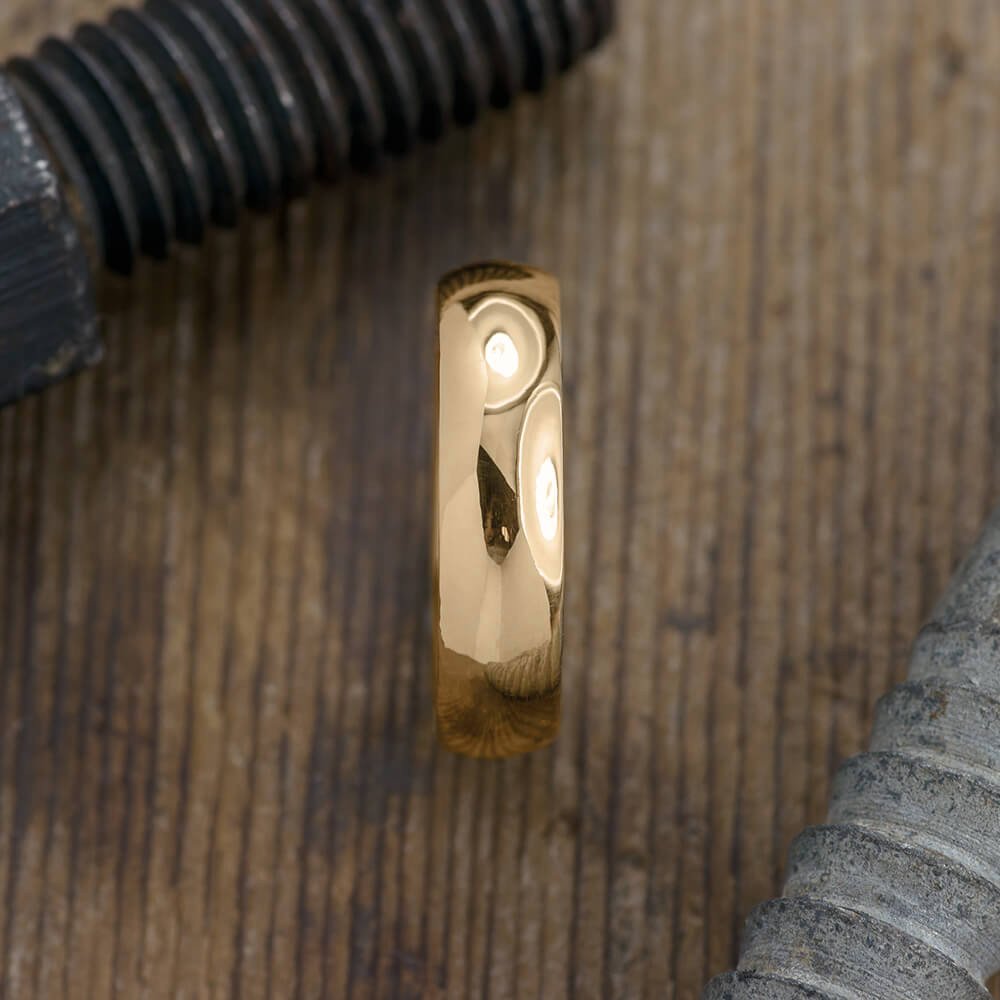 The band is a domed band and has a rounded exterior which gradually tapers off at the edges.