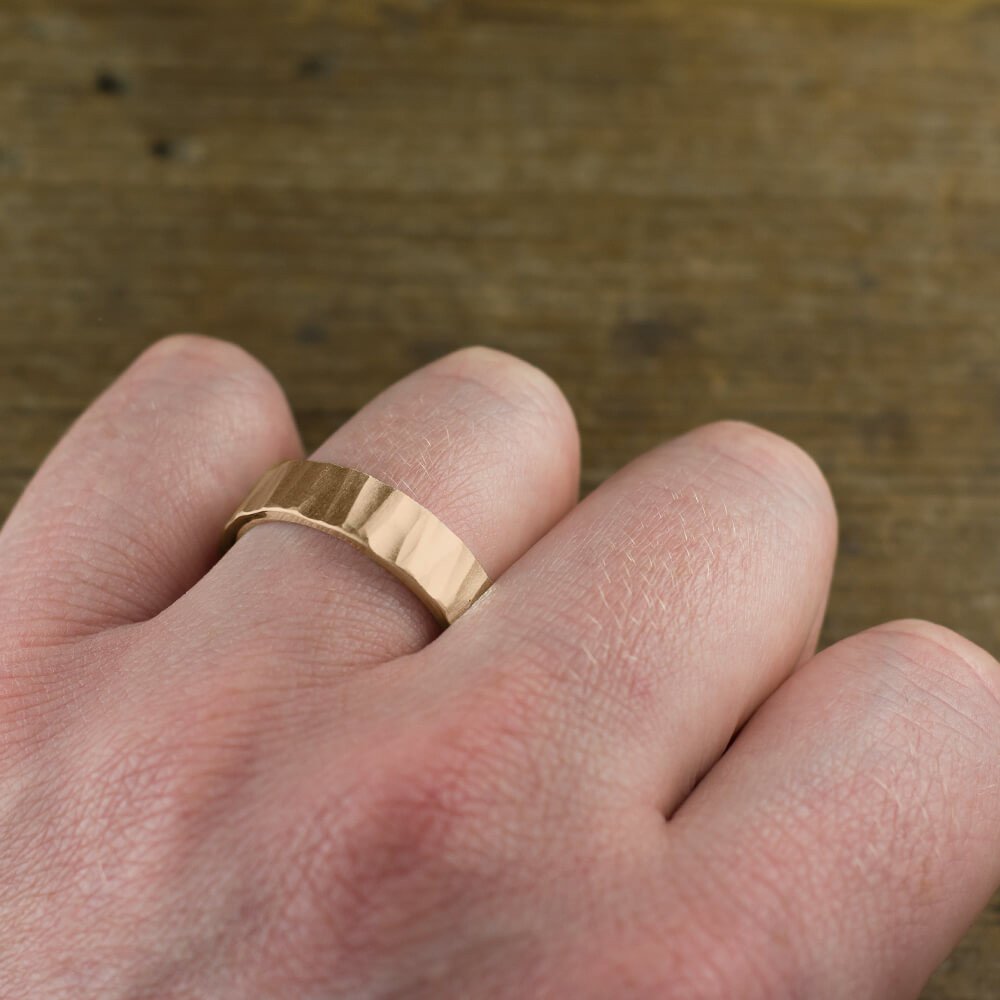 This ring is made of solid recycled 14k peach gold with wood grain textured finish, all done by hand giving the ring unique character. The exterior wood grain has a matte finish while the inner surface of the ring has a high polished finish.