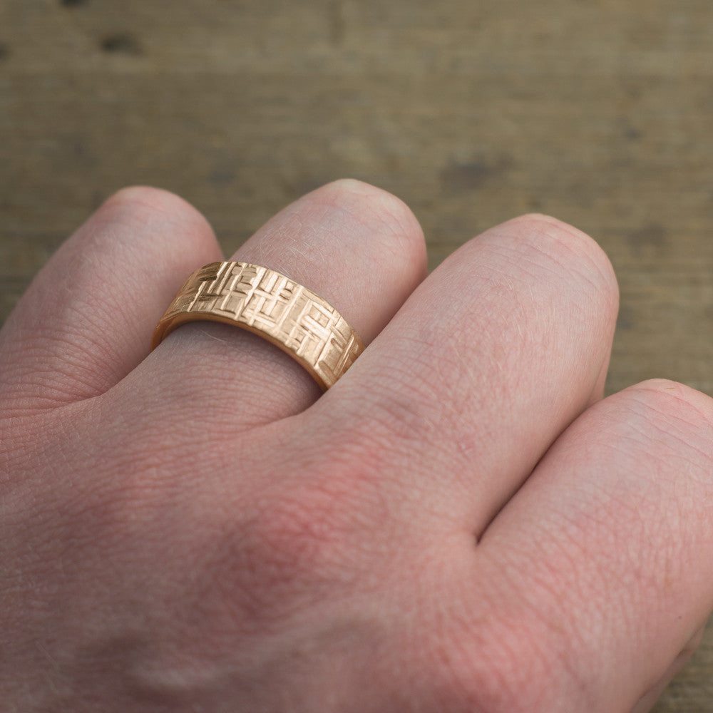 This ring is made of solid recycled eco friendly 14k recycled peach gold. The band is so simple and traditional. The outside of the ring has been given a hand textured brushed matte finish and the inside and edges of the ring a high polished finish.
