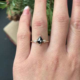 This beautiful and dainty ring features a black kite rose cut diamond. The diamond is a top quality natural diamond; it is opaque with unique facets that catch the light. The kite diamond is flanked on either side by a cluster of sparkly GHSI white round accent diamonds that taper seamlessly into the band.