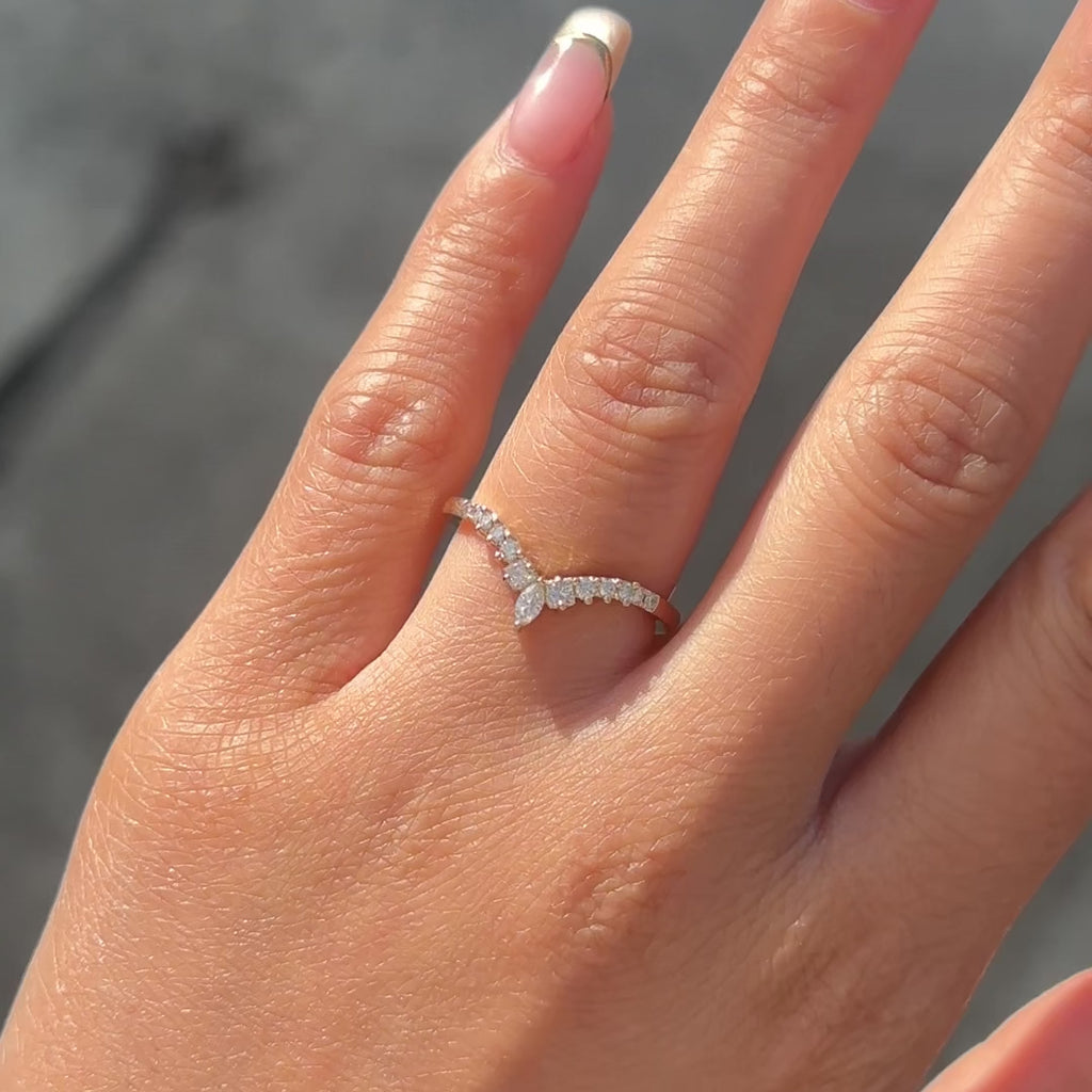 This timeless and unique wedding band features white diamonds in various shapes with a stunning marquise diamond as the focal point. This ring has a v-shape that will complement many different engagement ring styles!