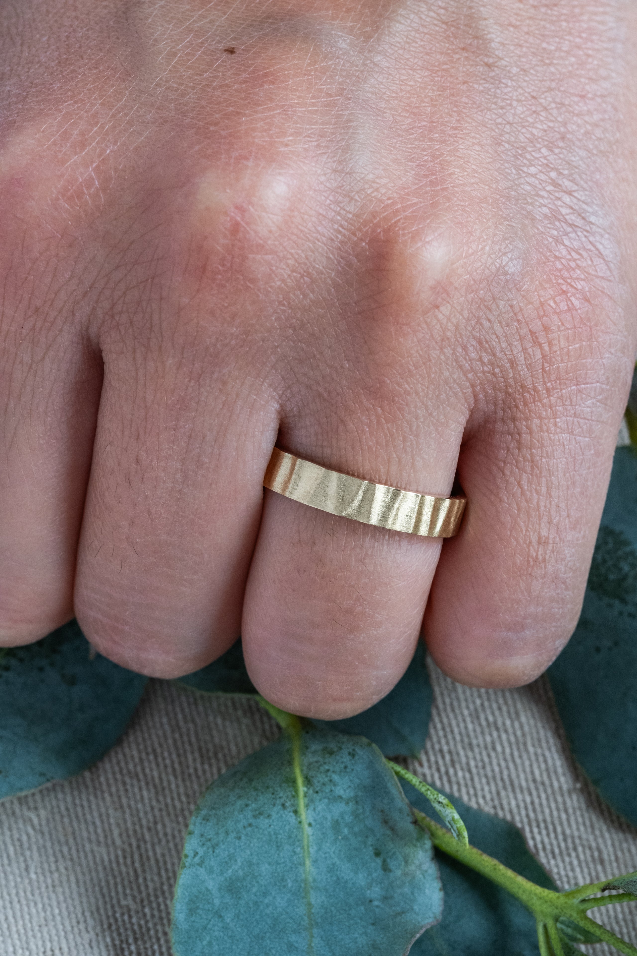 This ring is made of solid recycled 14k Yellow Gold; each ring is textured by hand adding a rugged, durable surface that looks like naturally occurring wood grain. The inside of the band is polished smooth, and fits comfortably around your finger.