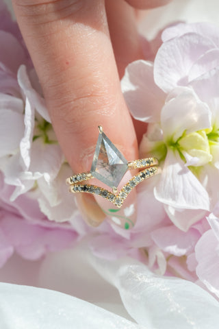 A simple hand crafted Ombre Diamond V shaped wedding band to be worn alone, stacked in multiples, or to match any number of engagement rings! The V contour is formed by .15 carats of grey, black and white diamonds