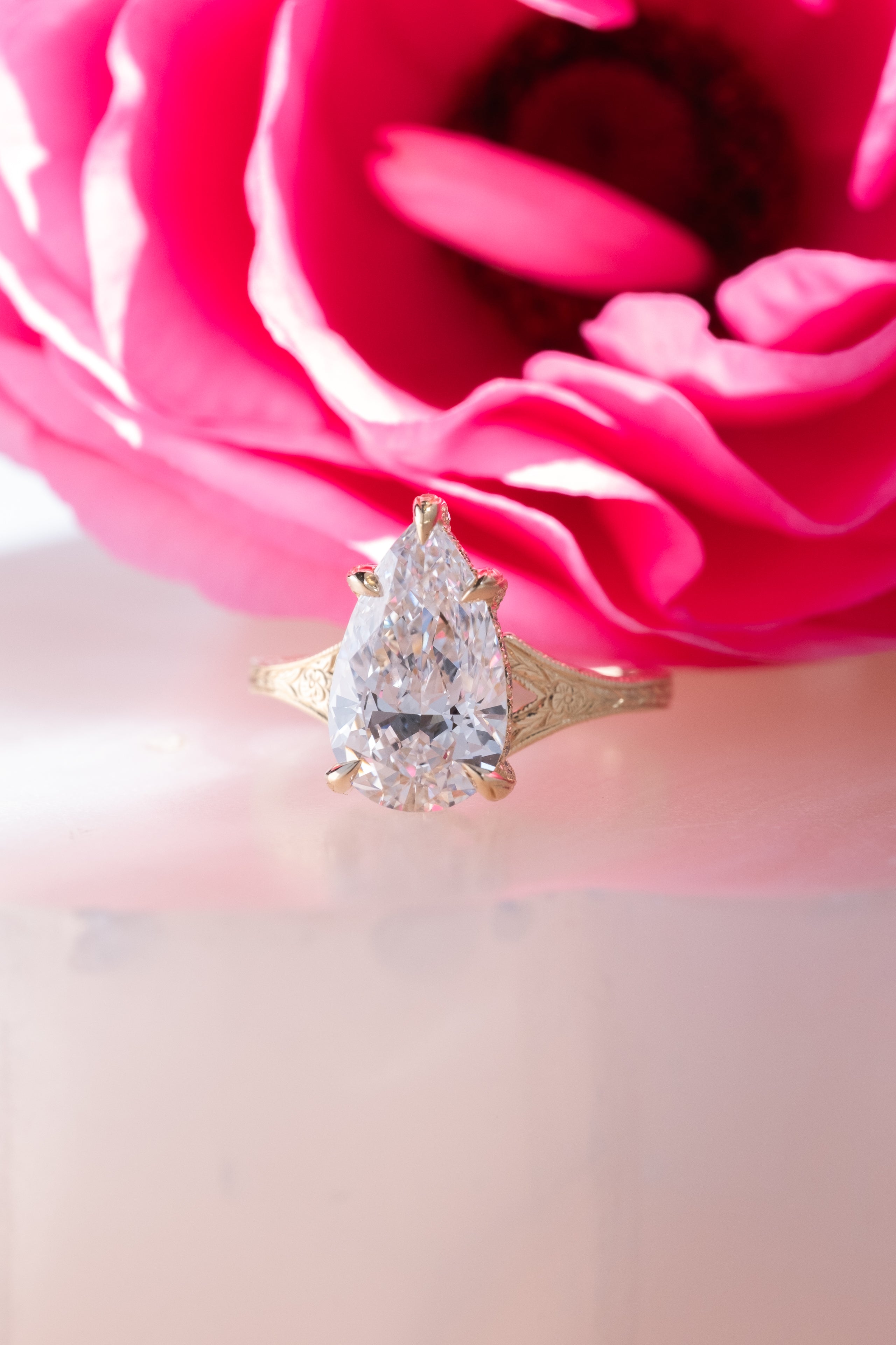 The pear is safely set into 6 prongs with milgrain detailing around the GHSI white accent diamonds that are set into the prongs and into the beautiful raised, scalloped setting. The ring also showcases a V shaped split shank that has been intricately hand engraved. The entire ring is made of recycled 14k yellow gold.