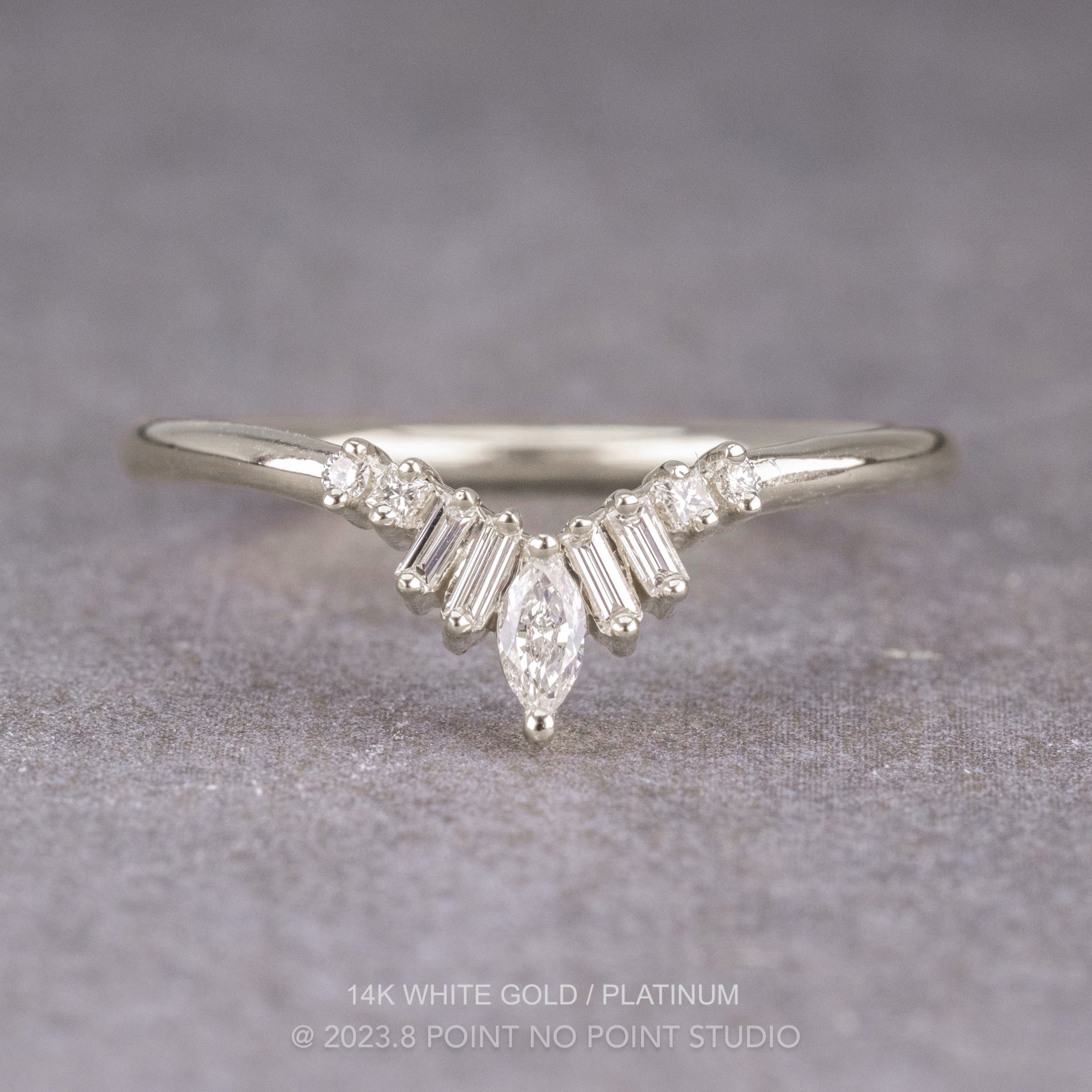 This stunning wedding ring features a v-contour of sparkly GHSI white diamonds in various shapes, with a striking marquise diamond at the tip that will complement many different engagement ring styles! This band can be worn alone, stacked in multiples or to match any number of engagement rings.