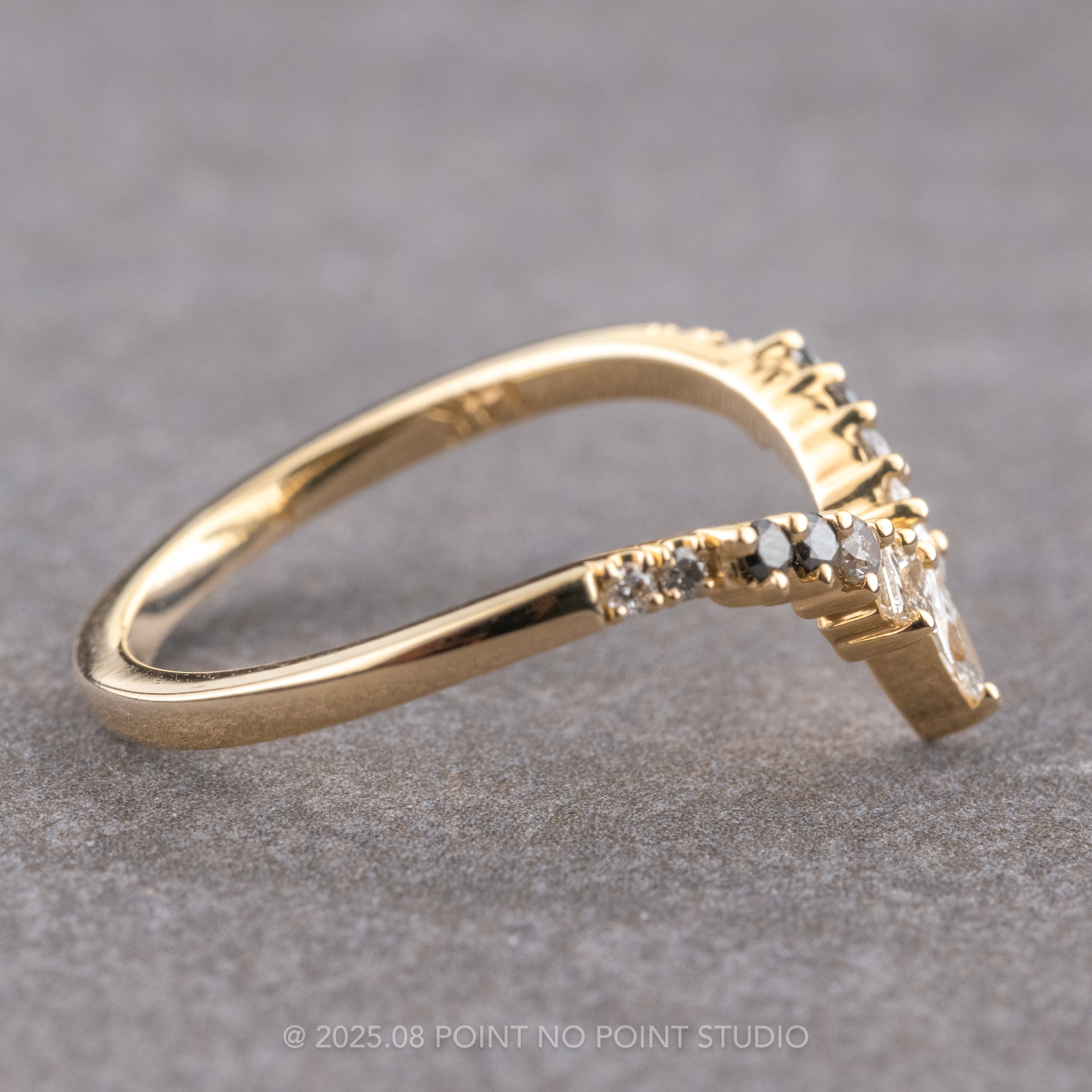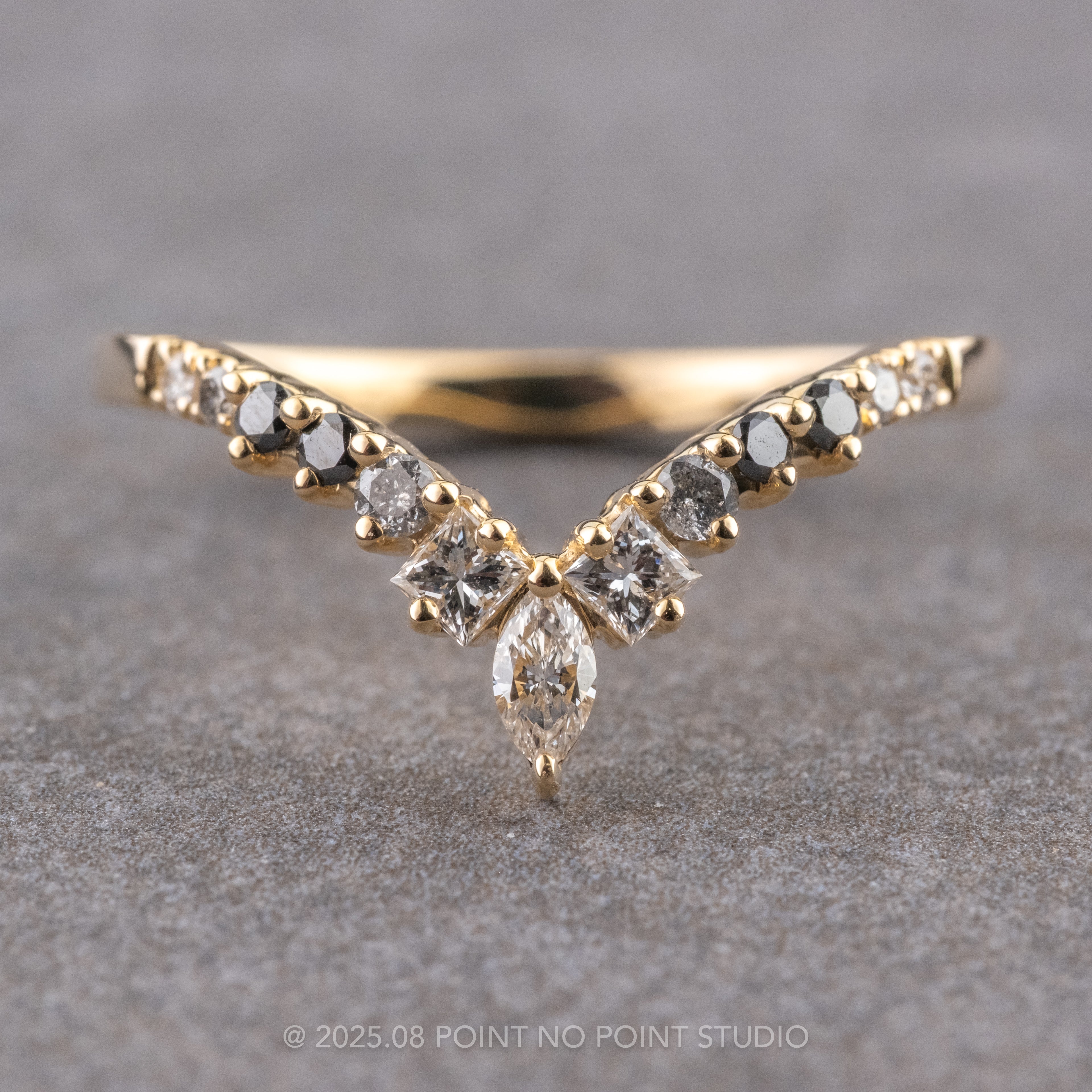 Sitting at the center of this v-contour band is a stunning GHSI white marquise diamond, followed by white, grey and black diamonds that gradient for a striking ombre effect. This wedding ring is truly a showstopper!