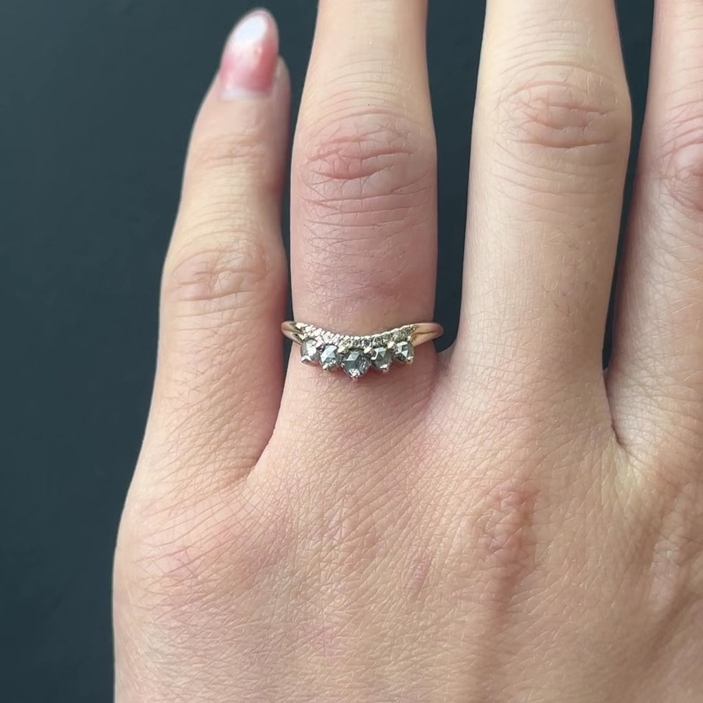 This timeless and unique wedding ring features striking grey rose cut diamonds with grey melees accents. The ring features a soft diamond contoured curve, which will flatter many engagement ring styles, or worn alone as a right hand ring or anniversary ring.