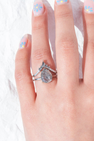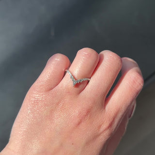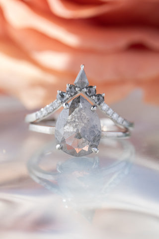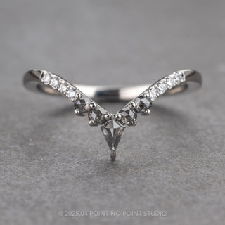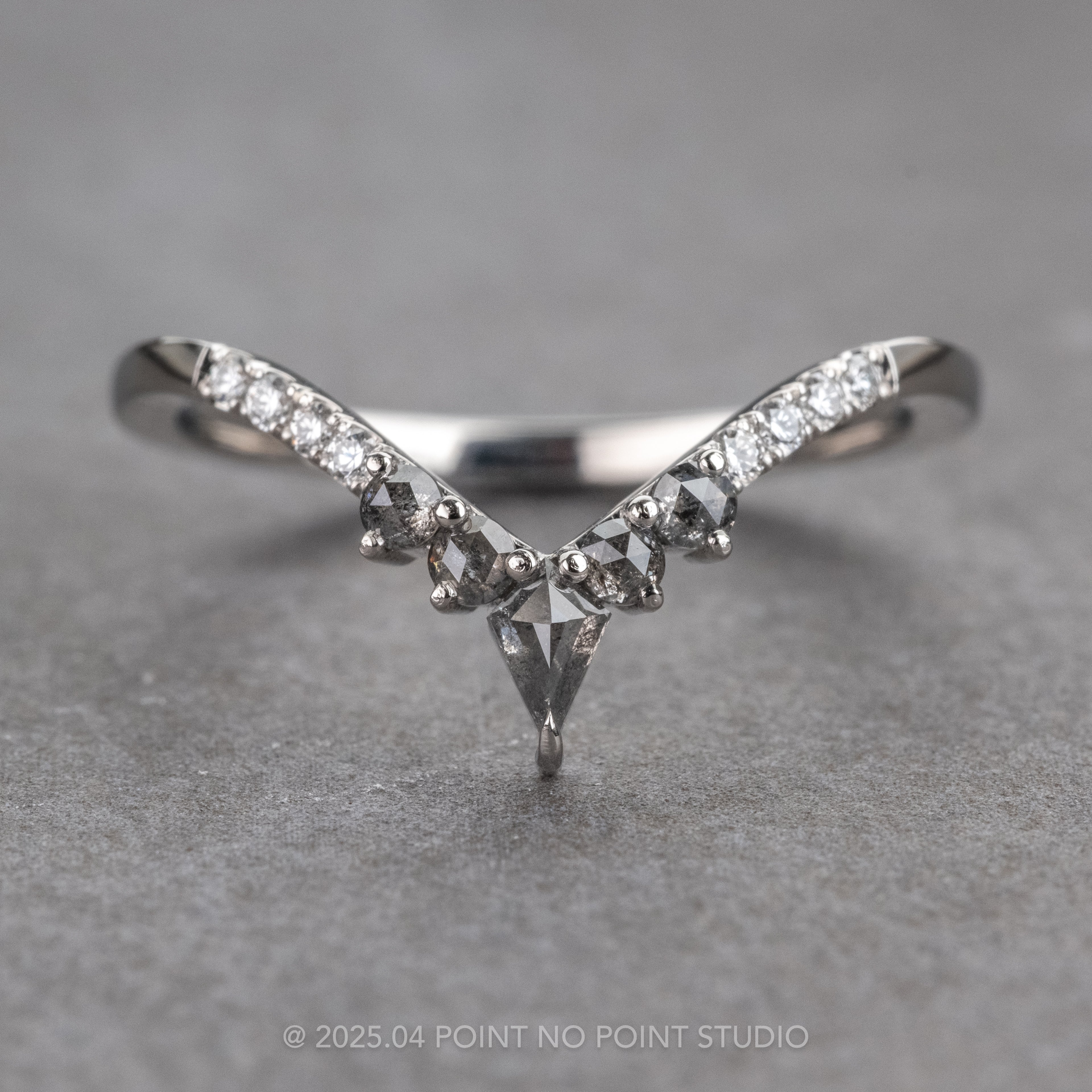 This timeless and unique wedding ring features striking natural kite diamond at the center of the V. The kite diamond is accented by salt & pepper round rose cut diamonds.