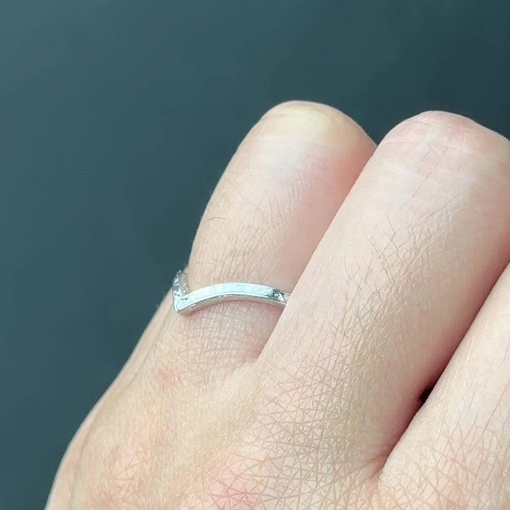 An elegantly enhanced version of our classic Vivian wedding ring with hand engraved ornate detailing. Set into the tip of the v-contour is a single GHSI white faceted diamond. This v-shaped wedding band can be worn alone, stacked in multiples, or to match any number of our PNPS engagement rings!
