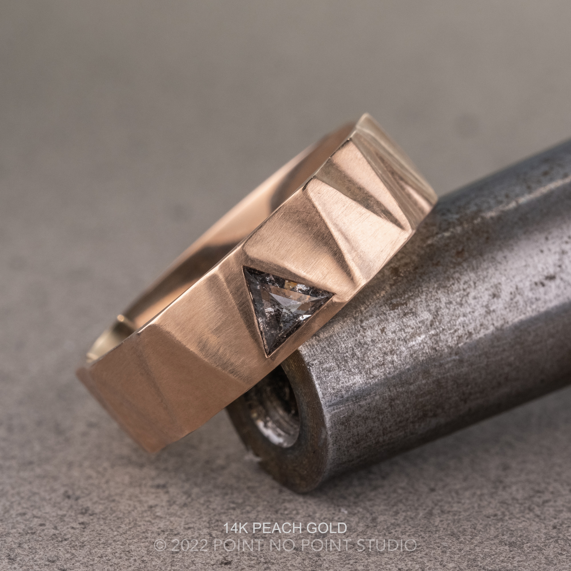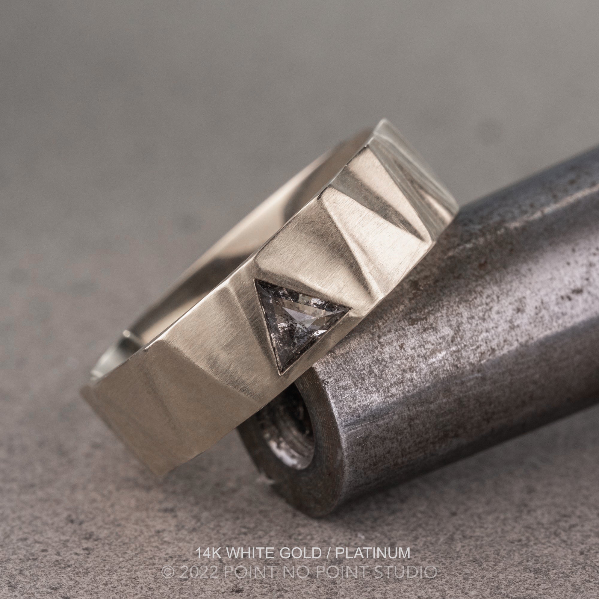 This unique ring has a triangle diamond flush set into the band. The triangle is a natural salt and pepper diamond. Due to the one-of-a-kind nature of the natural diamond, the band is approximately 7mm to allow for the slight differences in the triangle diamond measurements. There is a unique texture around the salt and pepper diamond and repeats all the way across the band.