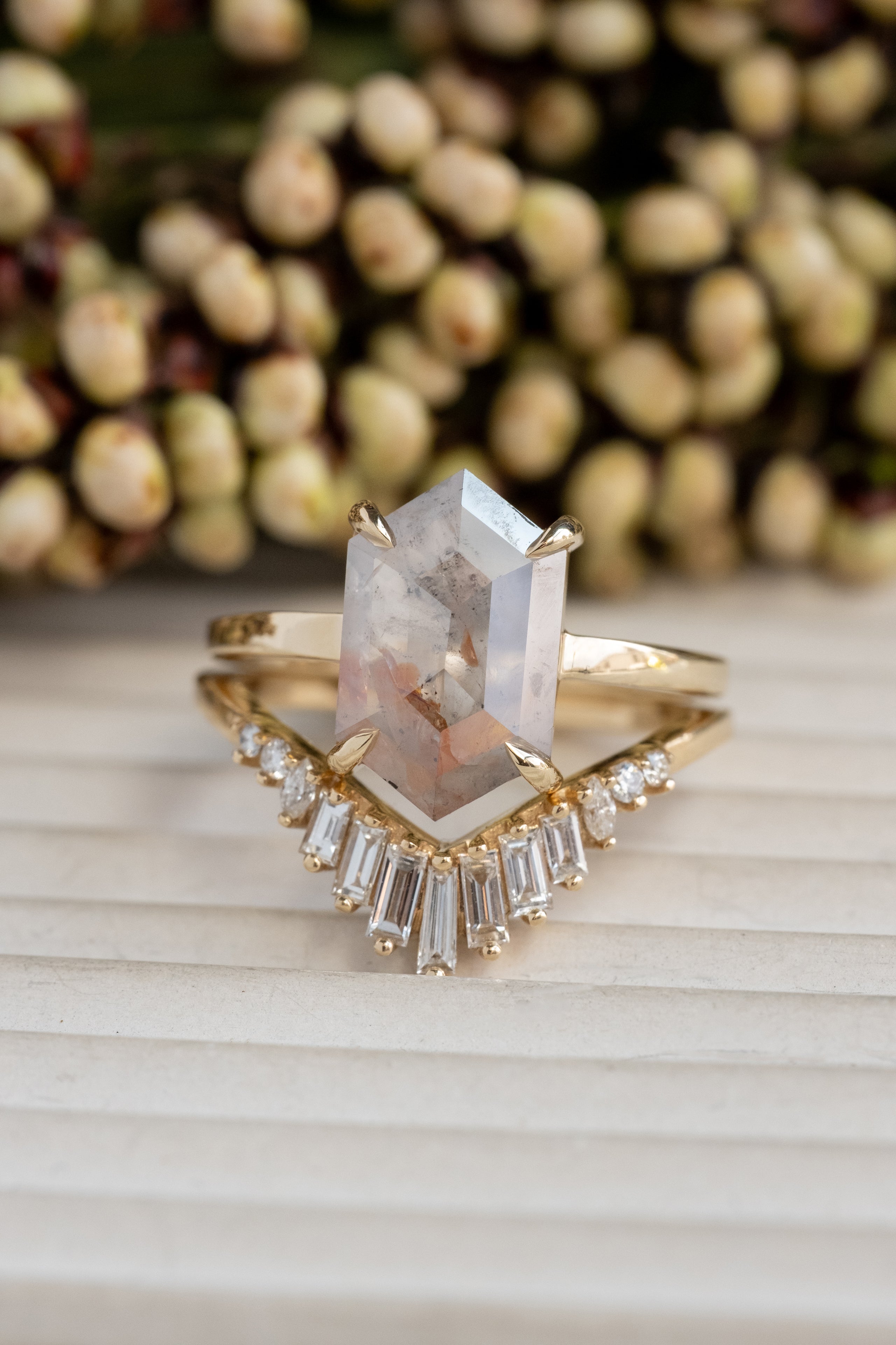 The entire ring is made of 14k yellow gold; the settings for the stones were made to be low profile and comfortable for everyday wear.