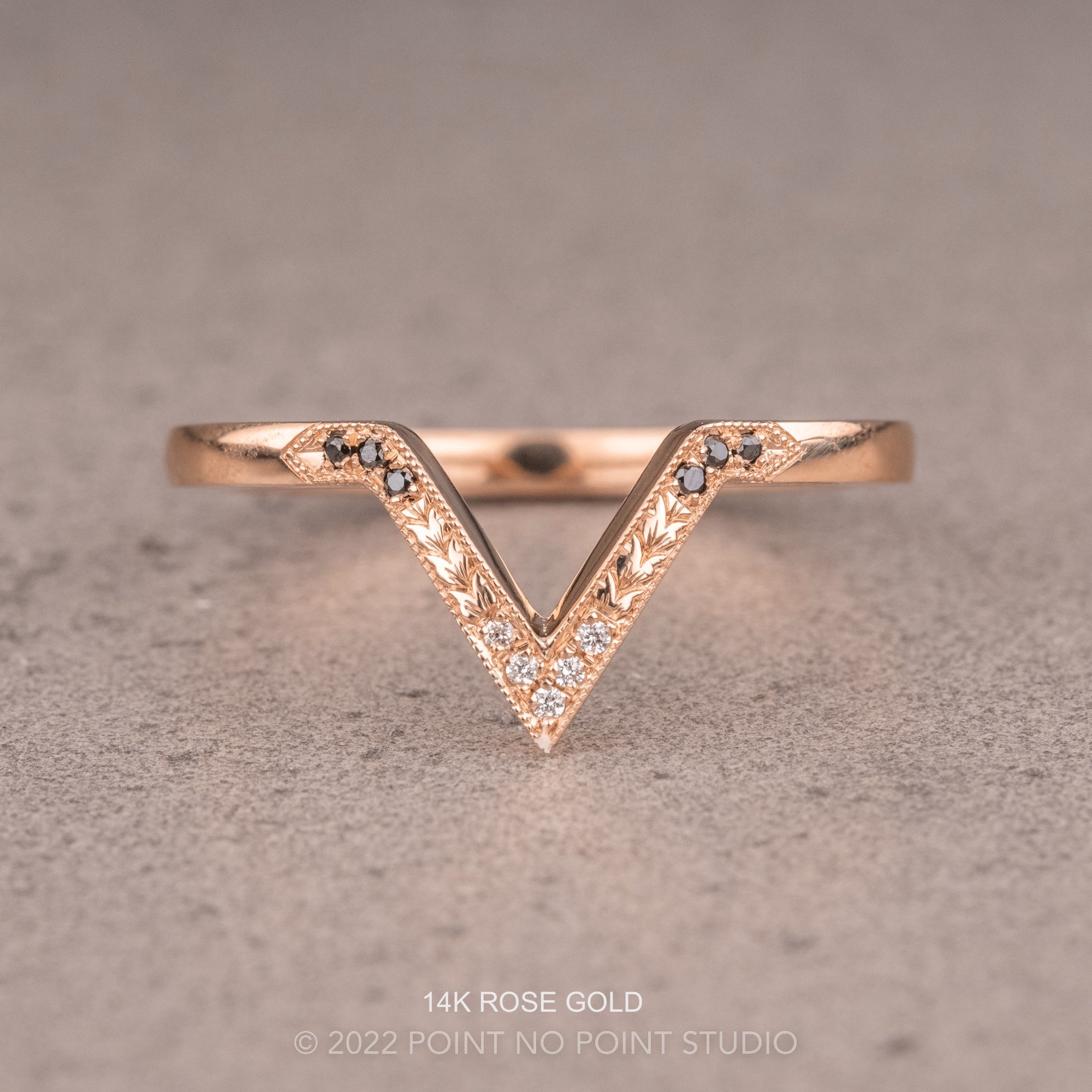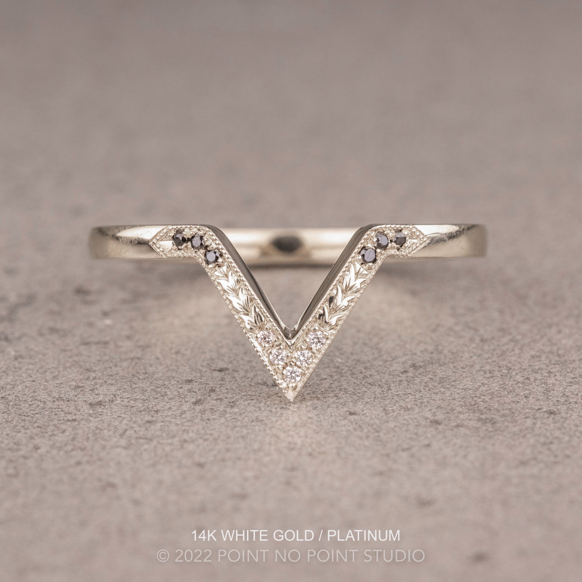 Set into the band are white and black diamonds for a stunning gradient effect. The ring is finished with a delicate milgrain border and our Jaylah wheat pattern for an extra vintage-inspired touch. The milgrain and engraving are all done completely by hand!